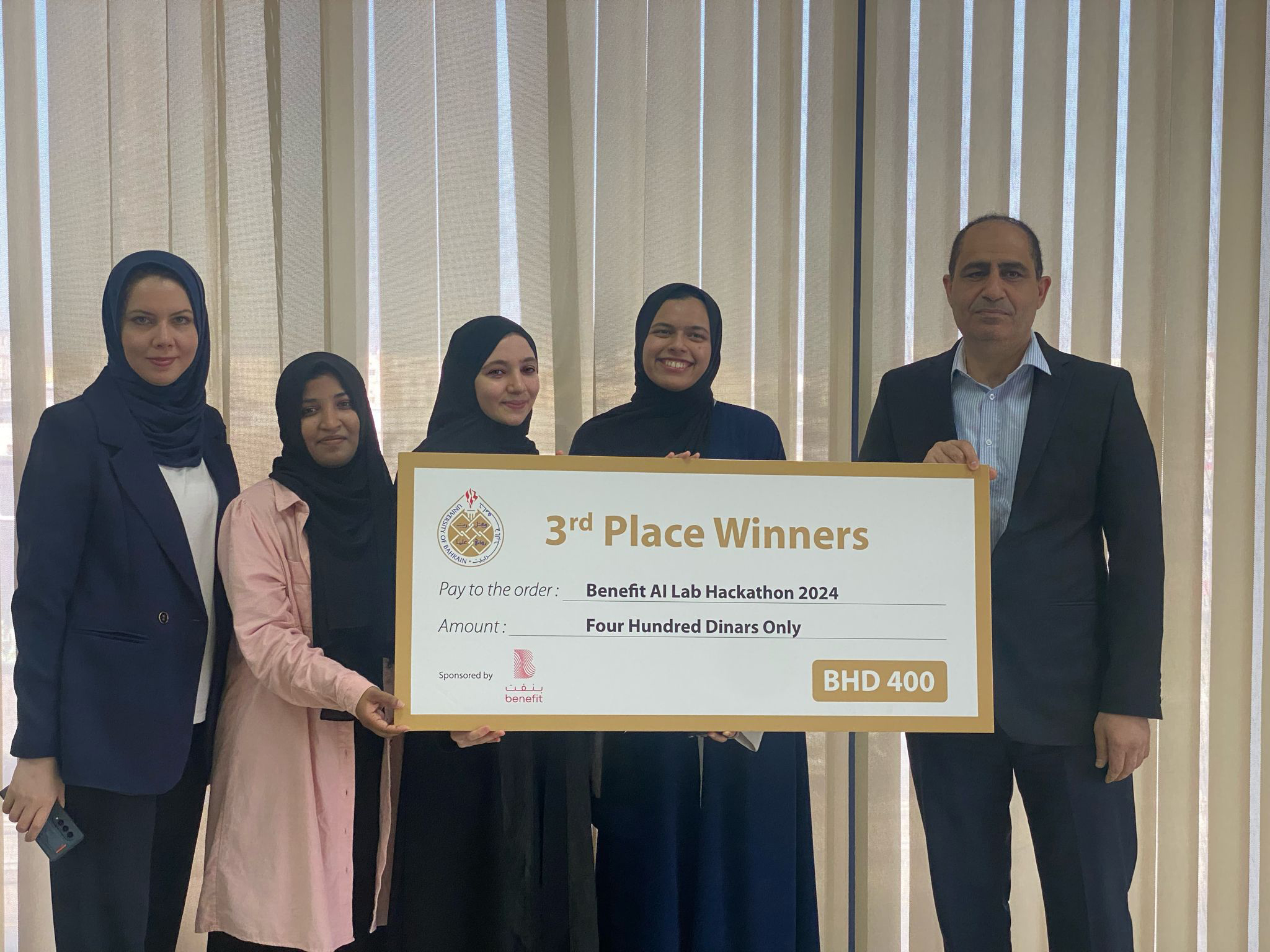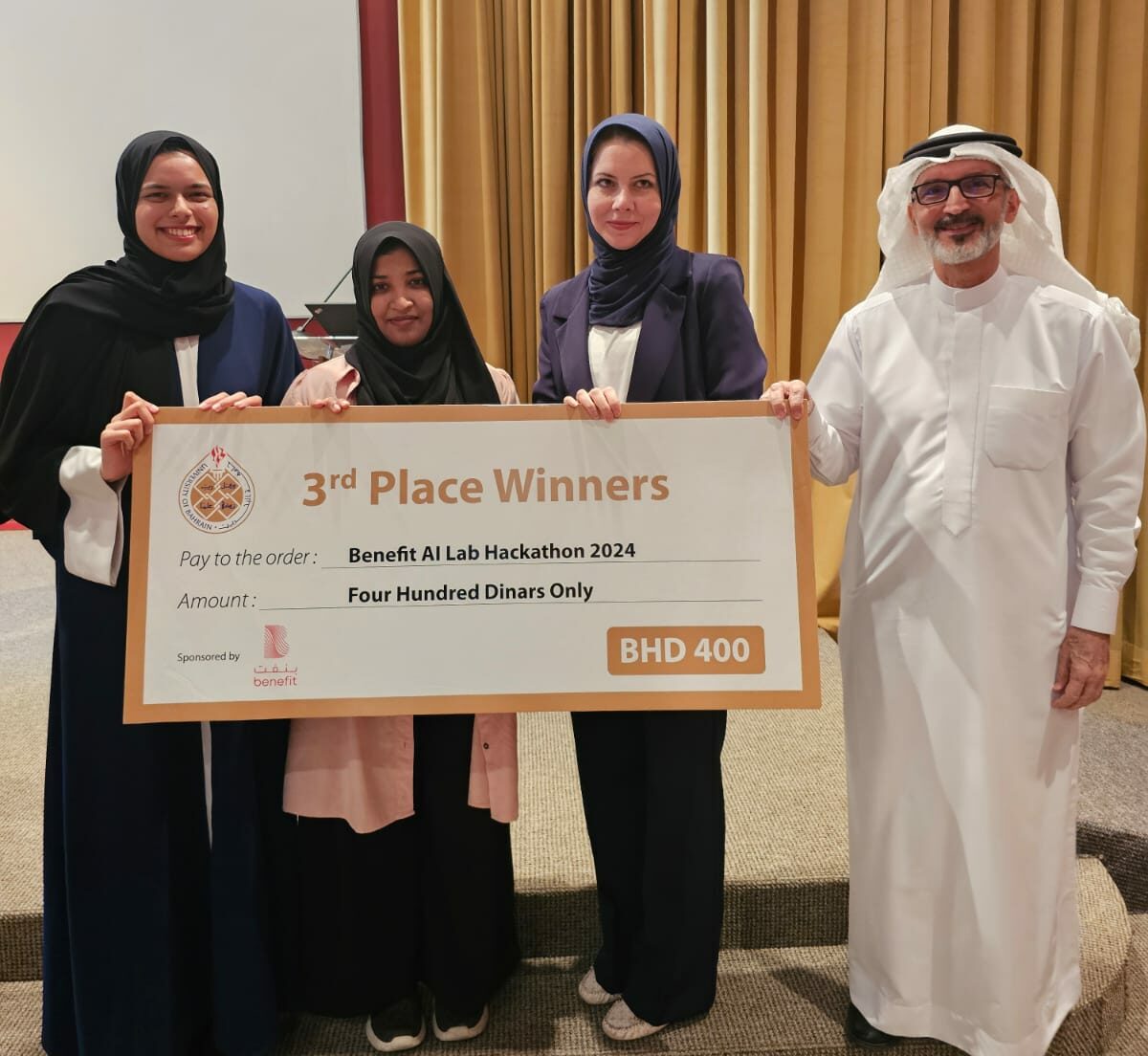 في انتصار مبهر، حصل فريق جامعة المملكة المكون من ثلاثة طلاب من قسم علوم الكمبيوتر على المركز الثالث في مسابقة Benefit Advanced AI Lab Hackathon لعام 2024، التي نظمتها جامعة البحرين. وتم تكريم الفائزين خلال حفل أقيم في 10 مارس 2025.