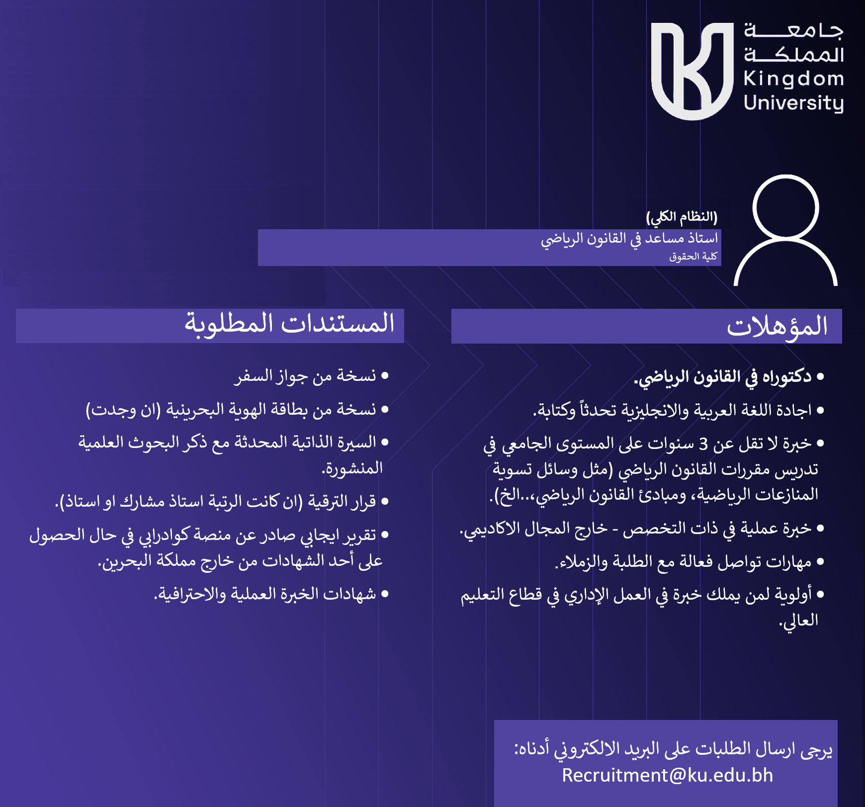 Kingdom University (KU) aim is to recruit and retain a diverse talent of qualified and experienced educators and administrators, providing them with the environment and opportunity to flourish in their relevant disciplines. KU is a licensed and accredited Private University by the Ministry of Education at the Kingdom of Bahrain and is located in Riffa at a remarkable Campus with all modern educational amenities. KU includes four Colleges: College of Business Administration, College of Engineering and Design, College of Information Technology, and College of Law. Each college offers academic programs in a large number of disciplines.
