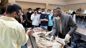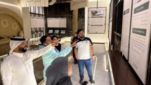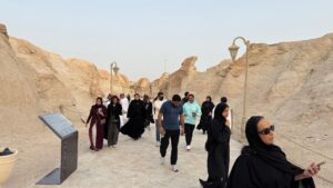 Following the university tour, the administration of King Faisal University arranged a comprehensive tourism program for the delegation. The program began with lunch at one of Al-Ahsaโs farms, where students learned about the regionโs agricultural nature and heritage. The delegation then headed to Jabal Qarah for a walking and exploration tour, discovering its distinctive natural and historical landmarks. The trip also included a visit to a date exhibition, followed by a visit to a palm exhibition and dinner at a unique heritage site.